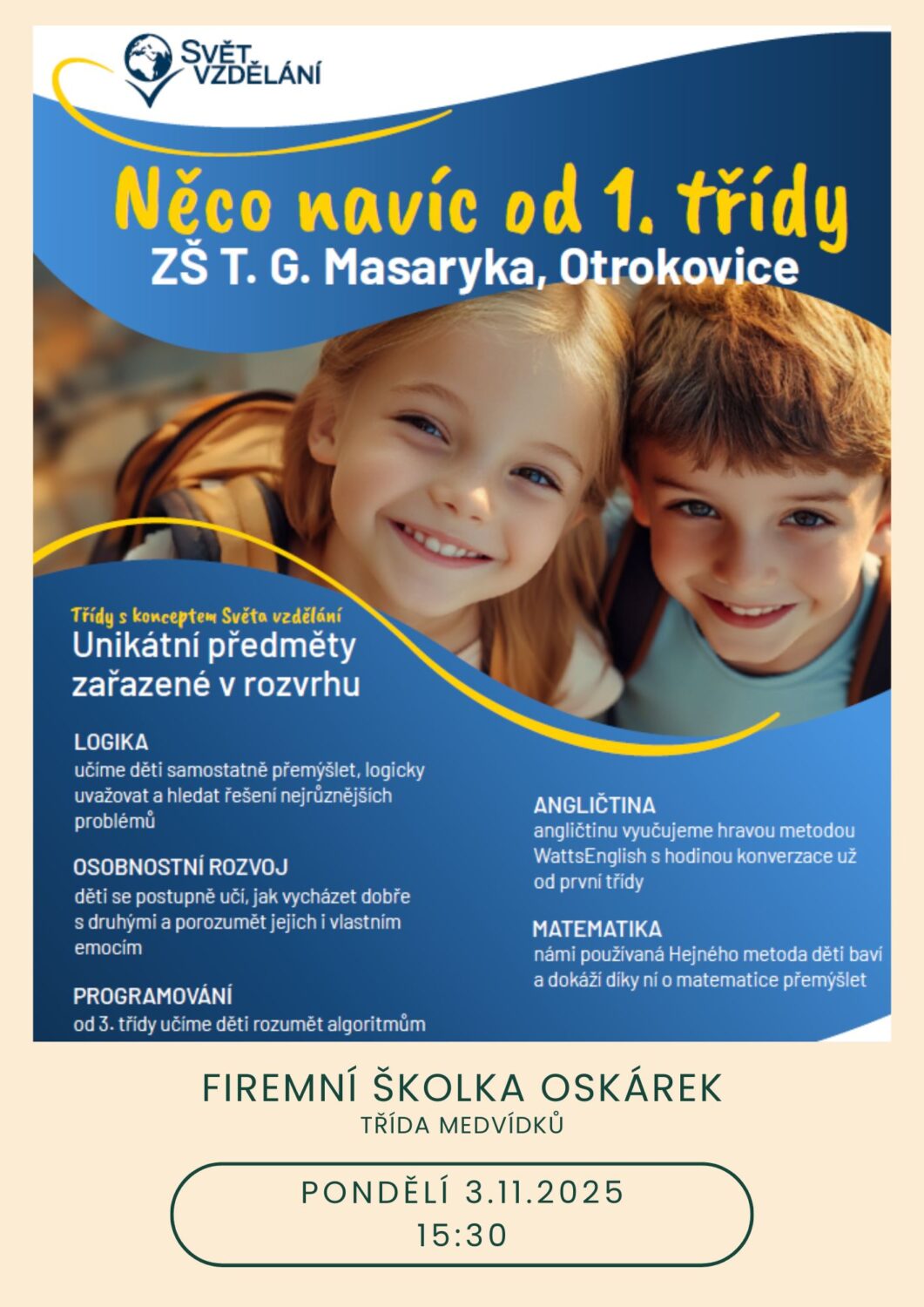 v pondělí dne 3.11.2025 se u nás ve FŠO uskuteční informační schůzka se zástupci Světa vzdělání ZŠ TGM Otrokovice, která se zaměřuje na vzdělávání dětí zvídavých a nadaných.