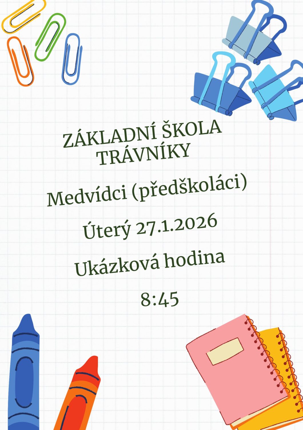 V úterý dne 27.1.2026 se s dětmi ze třídy Medvídků (předškoláci) zúčastníme ukázkové hodiny na ZŠ Trávníky.